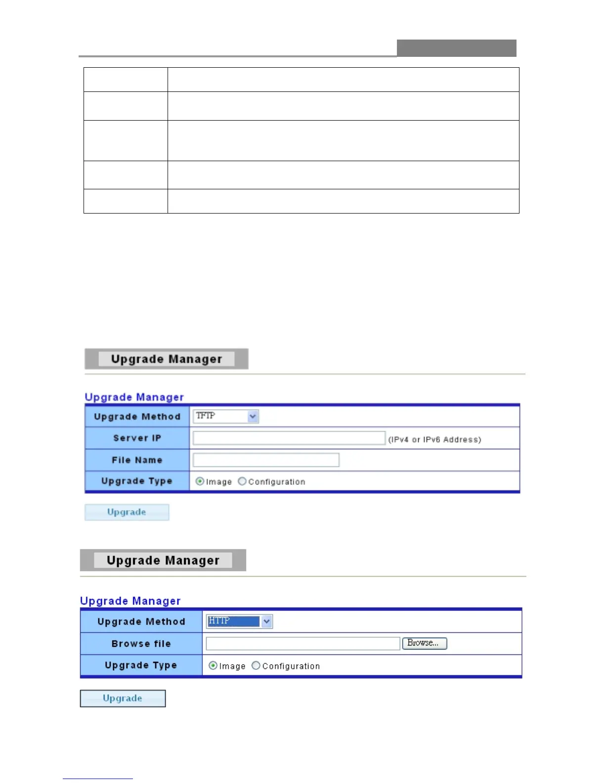 This page allow user to upgrade new firmware image or configuration file to the switch from remote