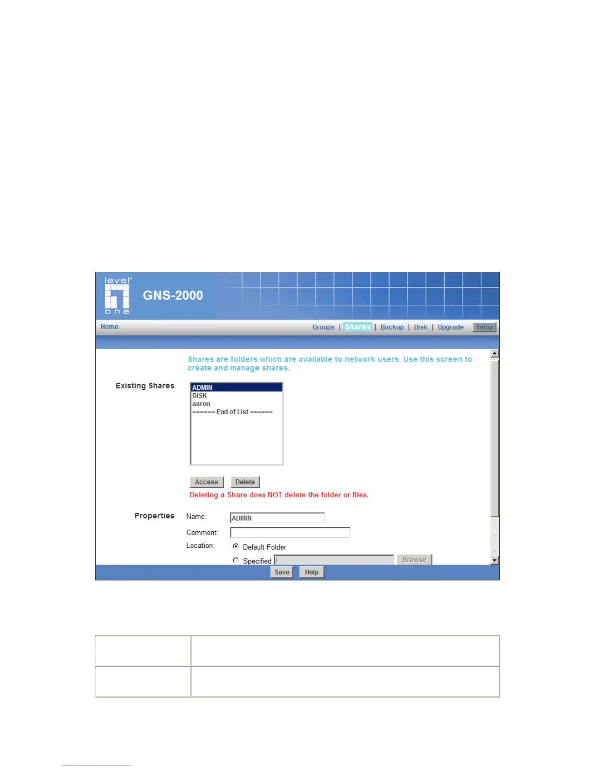 This screen allows you to manage the Shares that exist on the NAS Server. A "Share" is a