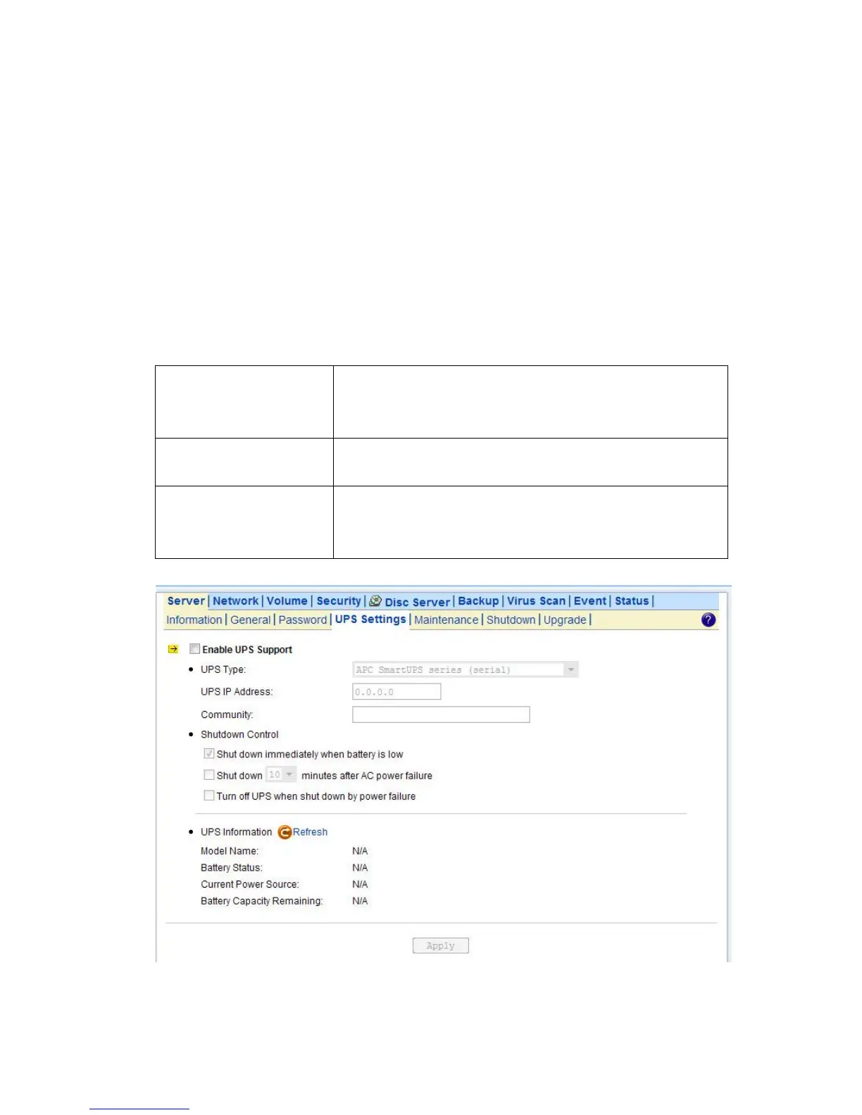 To use network-type UPS, connect the UPS to the LAN first. Then go to the Server UPS Settings page on the