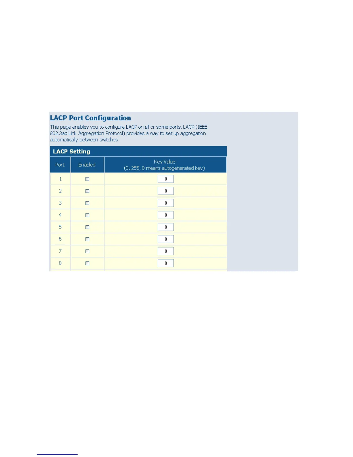 Web – Click TRUNKS, LACP Setup. Enable LACP on each port to be