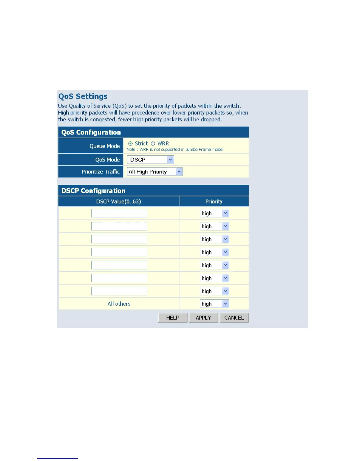When the QoS Mode is set to DSCP, the DSCP Configuration table is