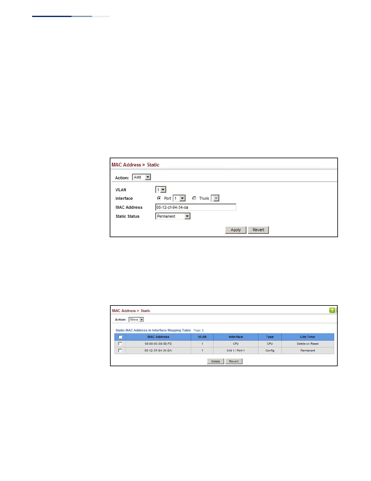 Specify the VLAN, the port or trunk to which the address will be assigned, the