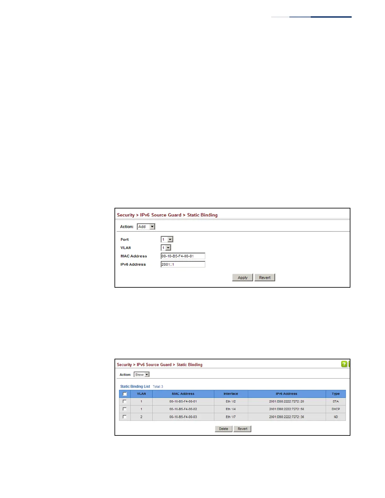 Figure 232: Configuring Static Bindings for IPv6 Source Guard