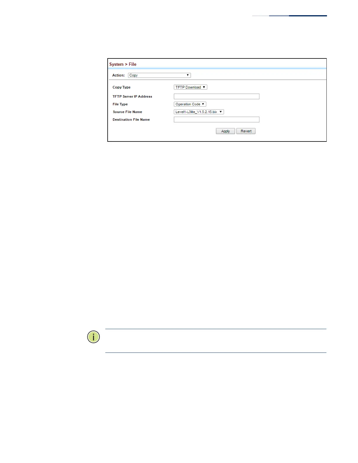 Use the System > File (Copy) page to save the current configuration settings to a