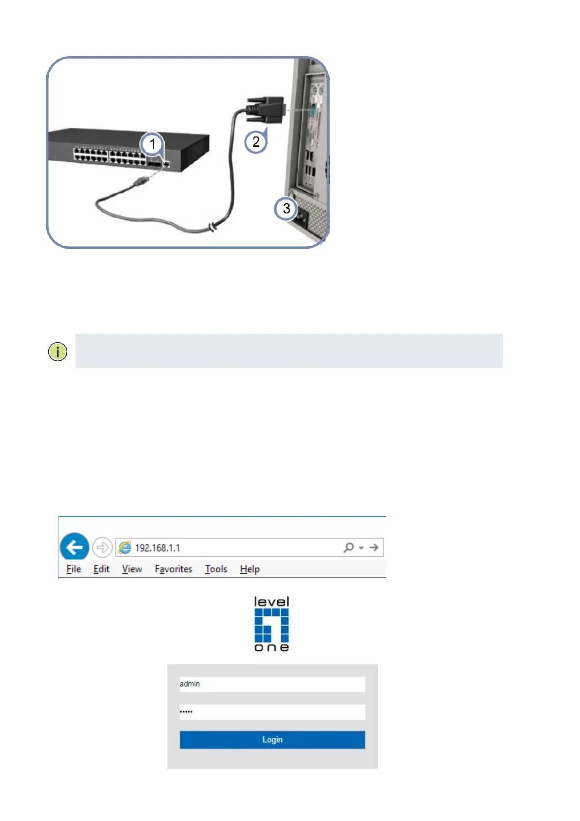 2. Configure the PC’s serial port: 115200 bps, 8 characters, no parity, one stop bit, 8 data bits,