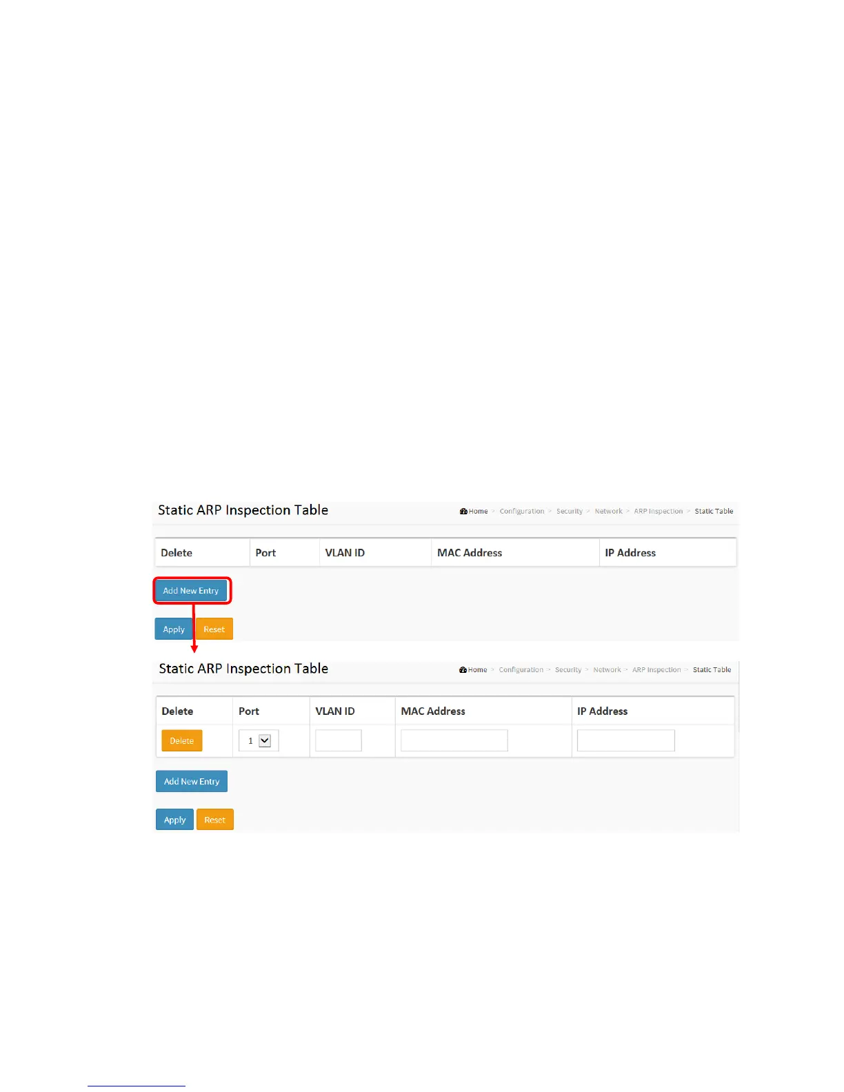 1. Click Configuration, Security, Network, ARP Inspection and Static Table.