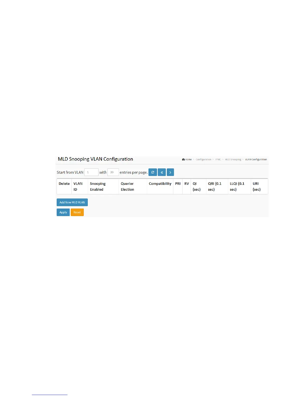 1. Click Configuration, IPMC, MLD Snooping, VLAN Configuration