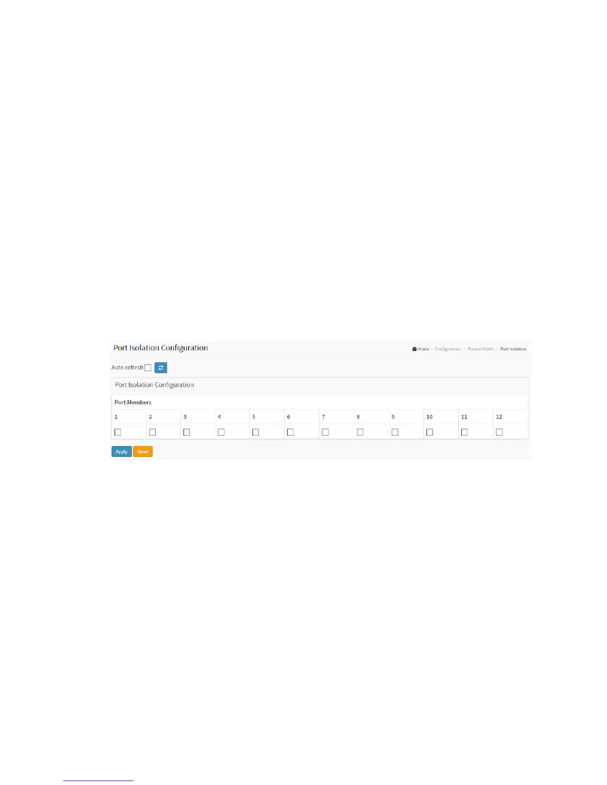This page is used for enabling or disabling port isolation on ports in a Private VLAN.