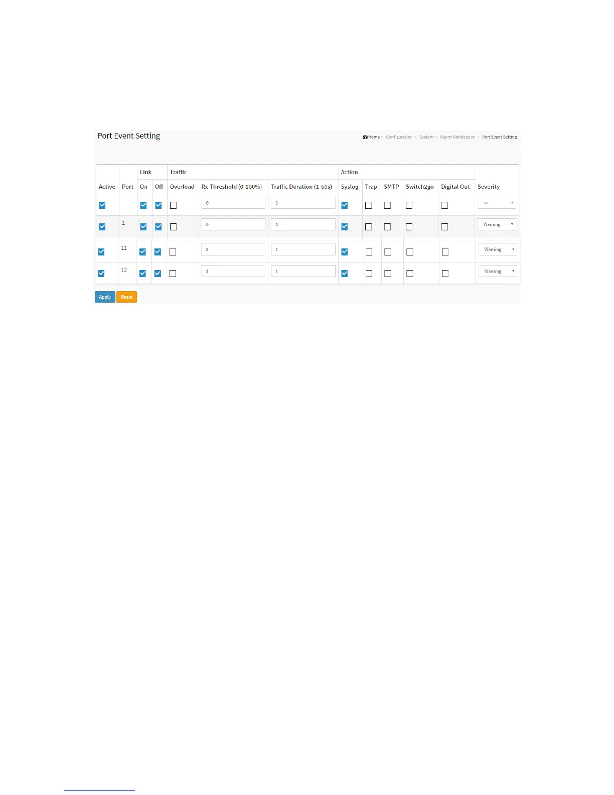1. Click Configuration, System, Alarm Notification and Port Event Setting.
