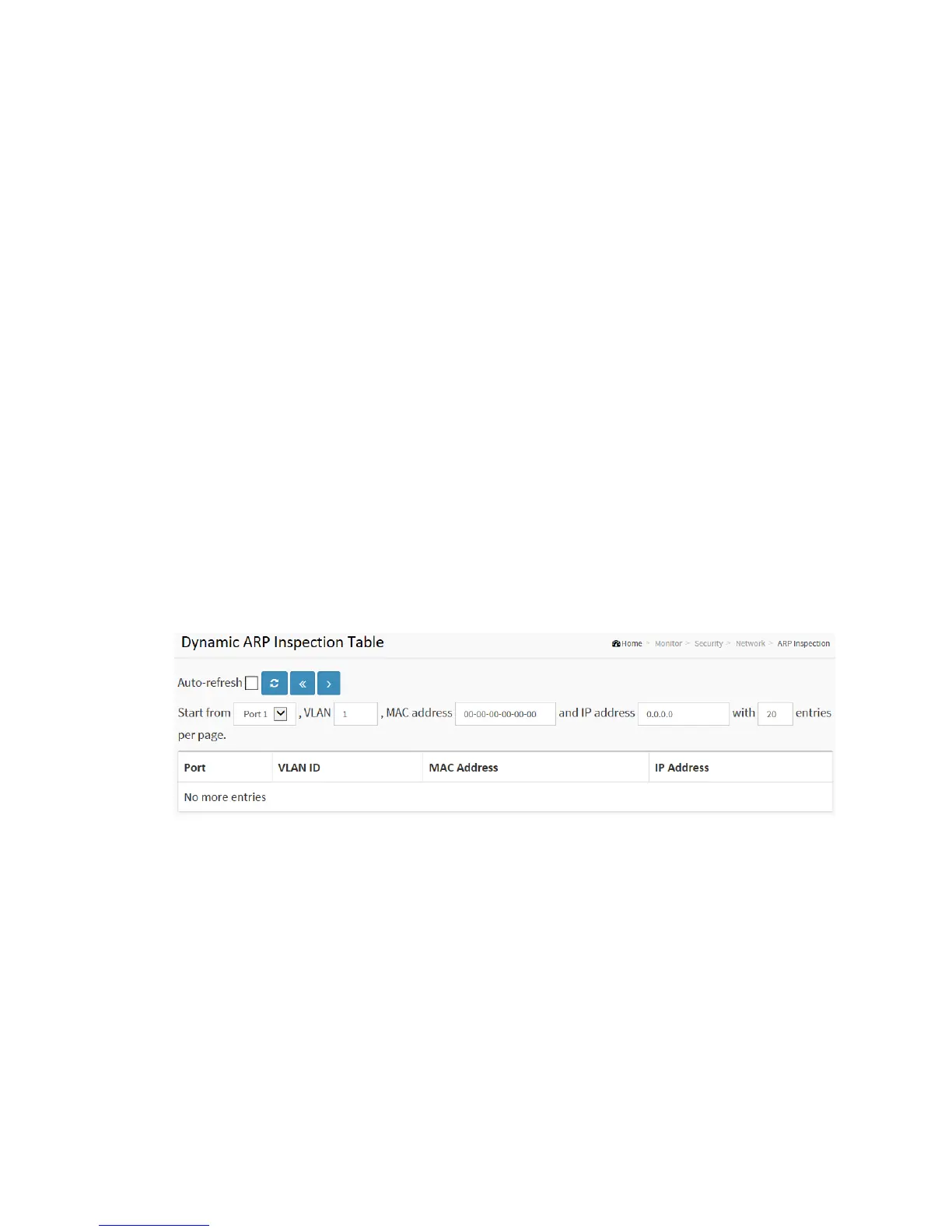 the switch. The Dynamic ARP Inspection Table contains up to 1024 entries, and is
