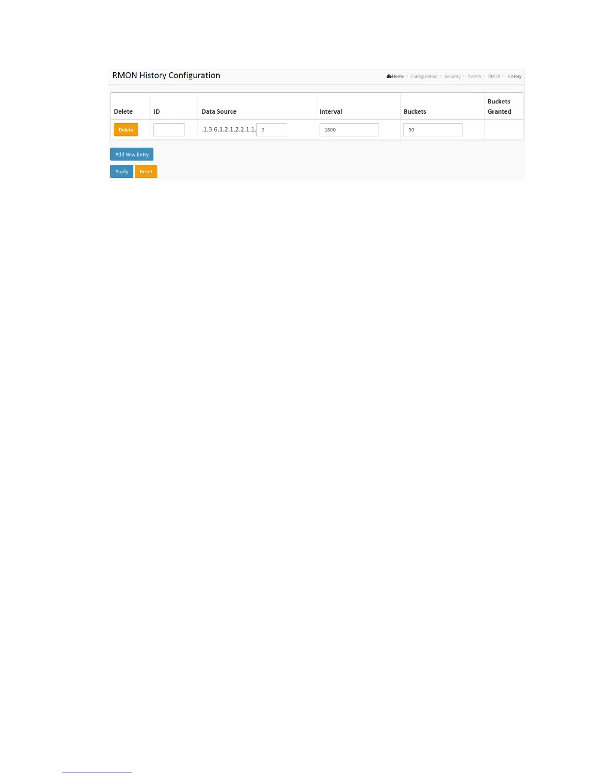 These parameters are displayed on the RMON History Configuration page: