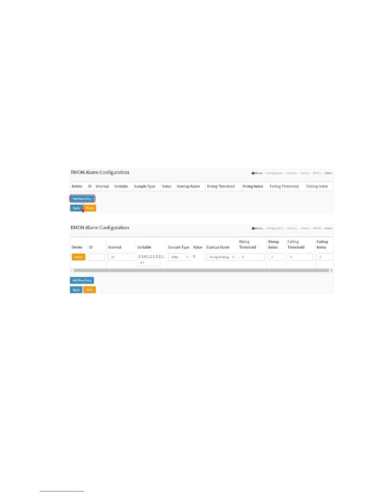These parameters are displayed on the RMON Alarm Configuration page:
