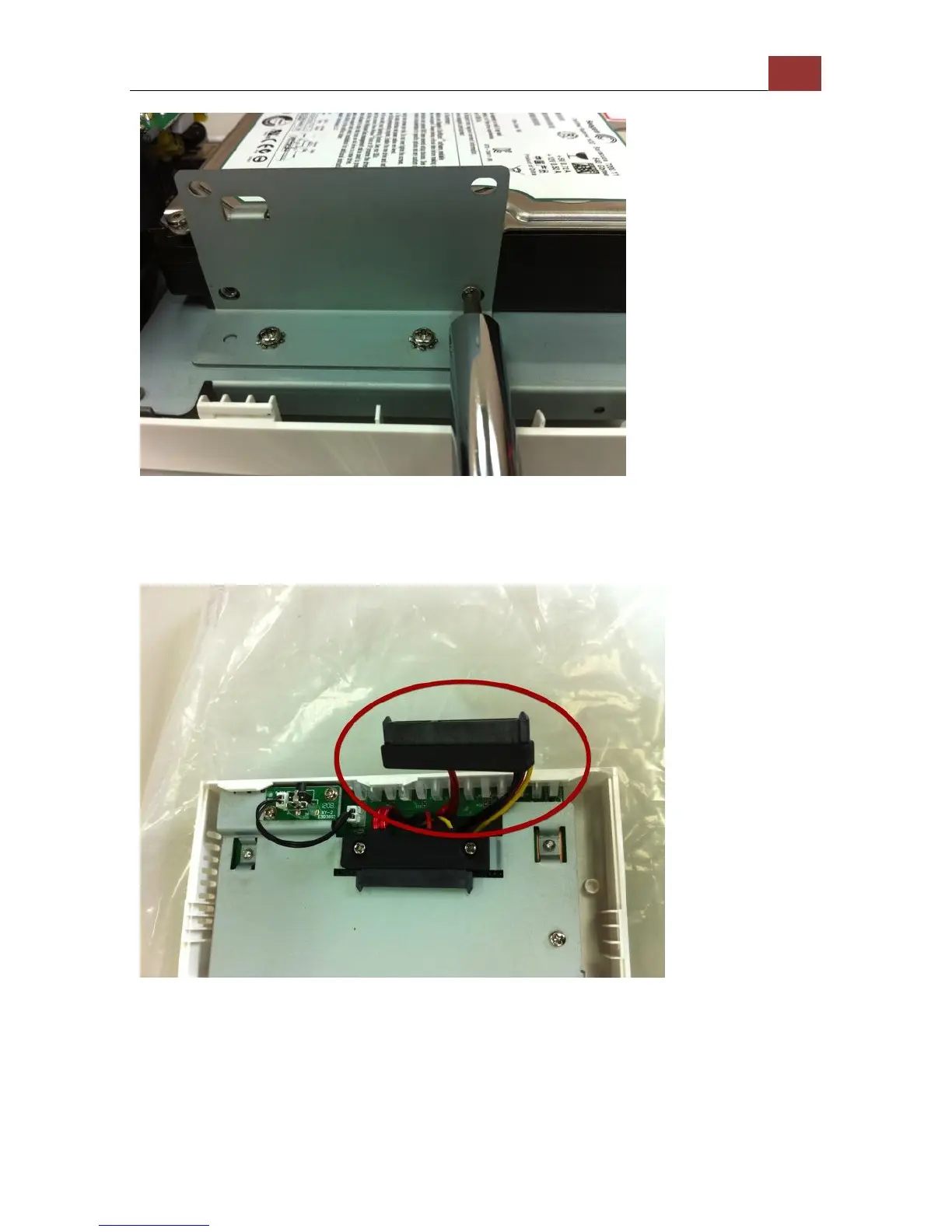 Install the top HDD by attaching it to the corresponding SATA cable