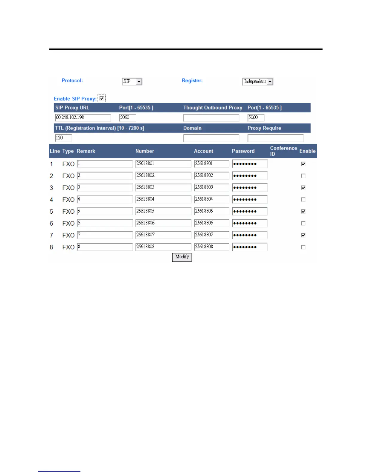 Global: All the lines of the gateway share same account to register.