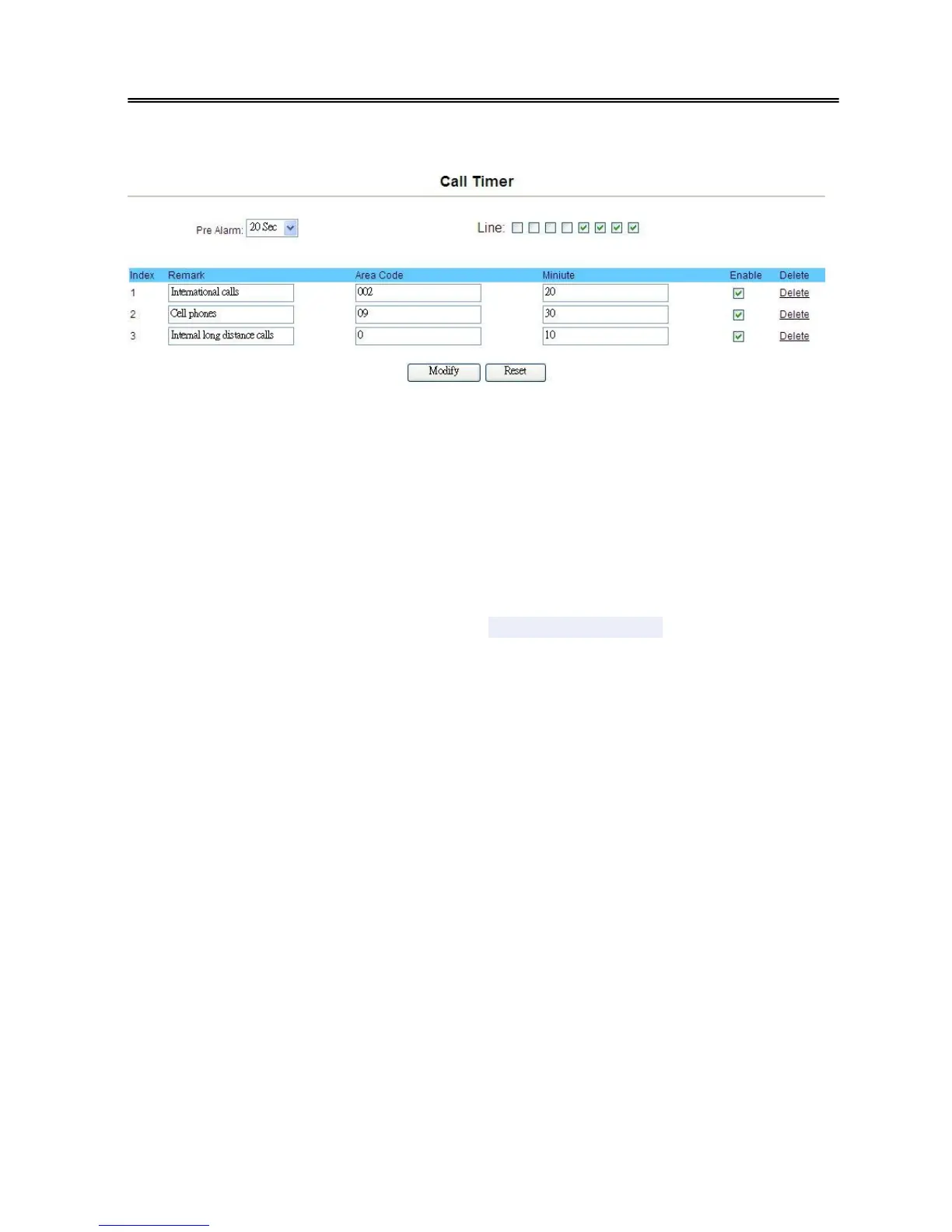 The gateway can enable to set the limit communication time to Line port by Area