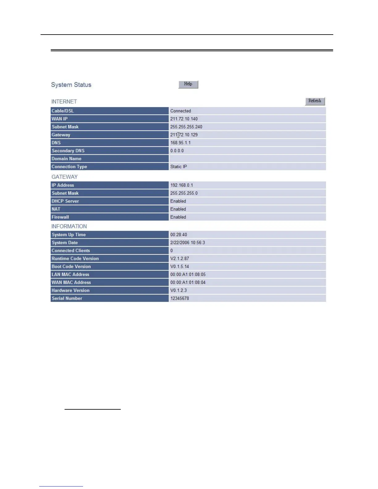 This page reveals the status of the gateway including WAN, LAN and some