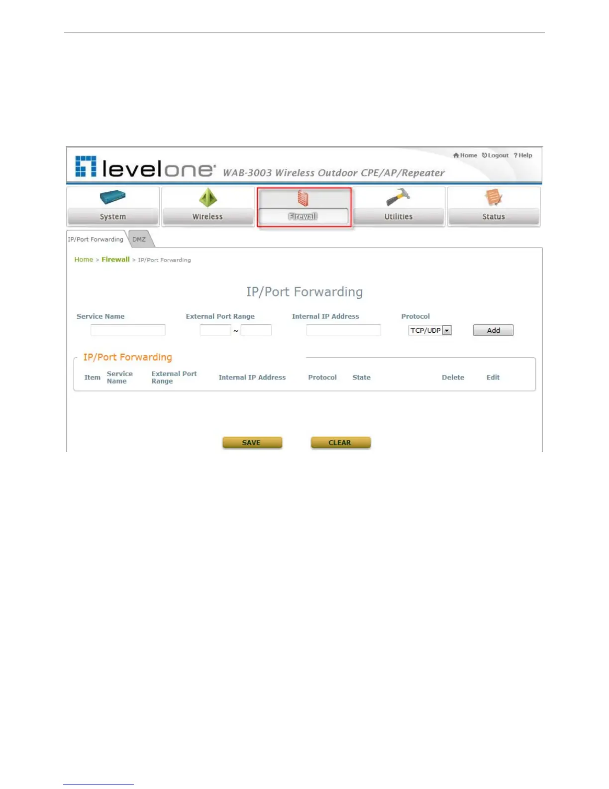The system supports the following firewall functions: IP/ Port forwarding and DMZ (Demilitarized