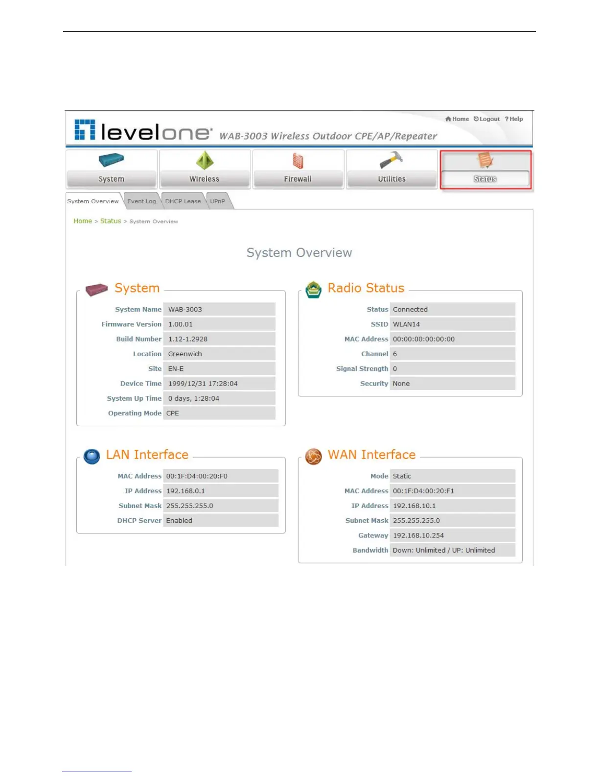 This section displays the status of System Overview, Event Log, DHCP Lease and UPnP.