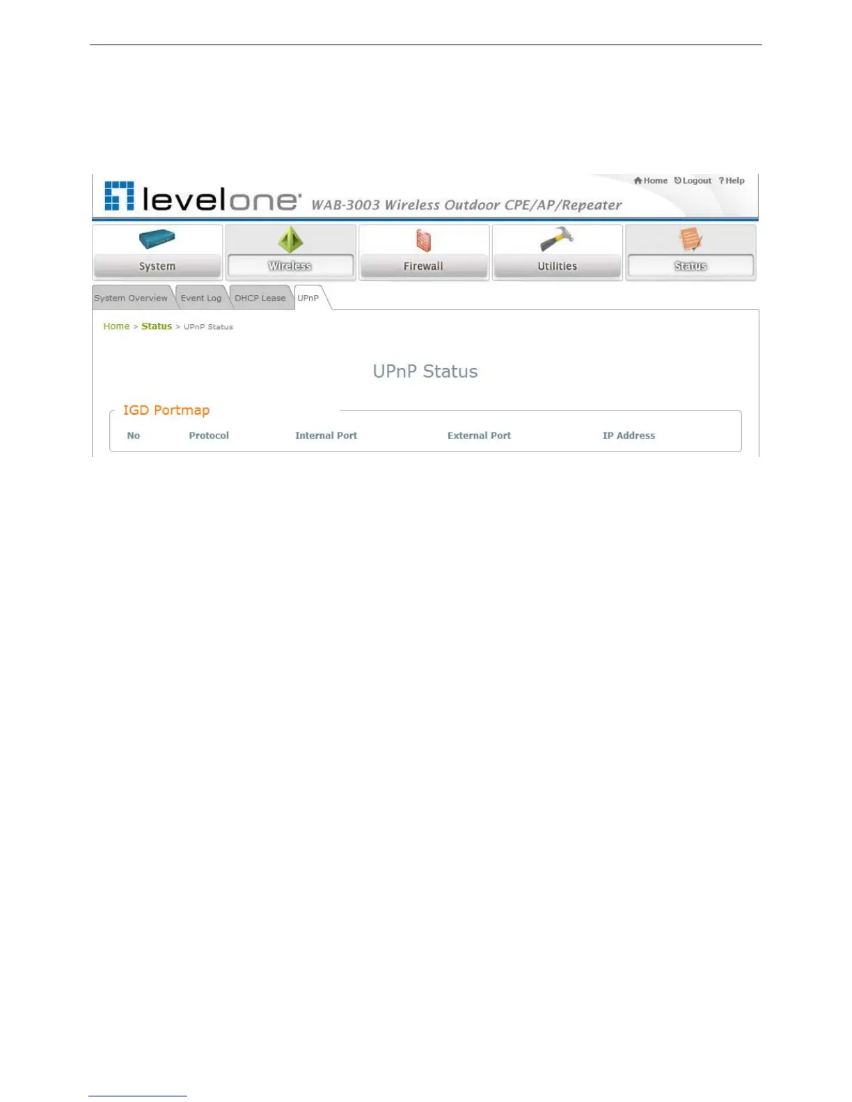 The table provides information about the UPnP overview such as Protocol, Internal Port, External