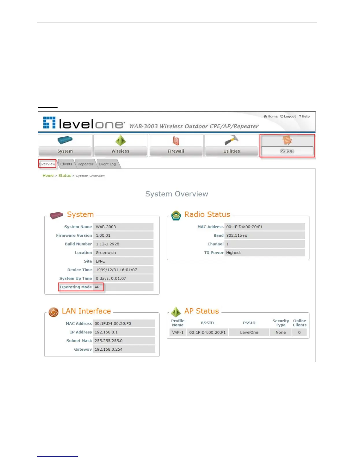 Click on the Status button and then select the System Overview tab. The Operating Mode is