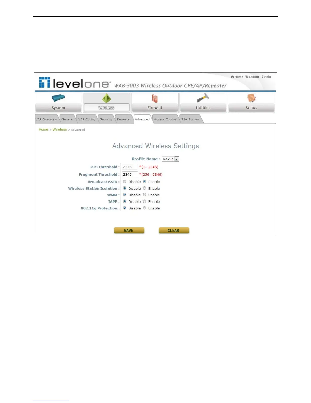 The advanced wireless settings for the system’s VAP profiles allow customization of data