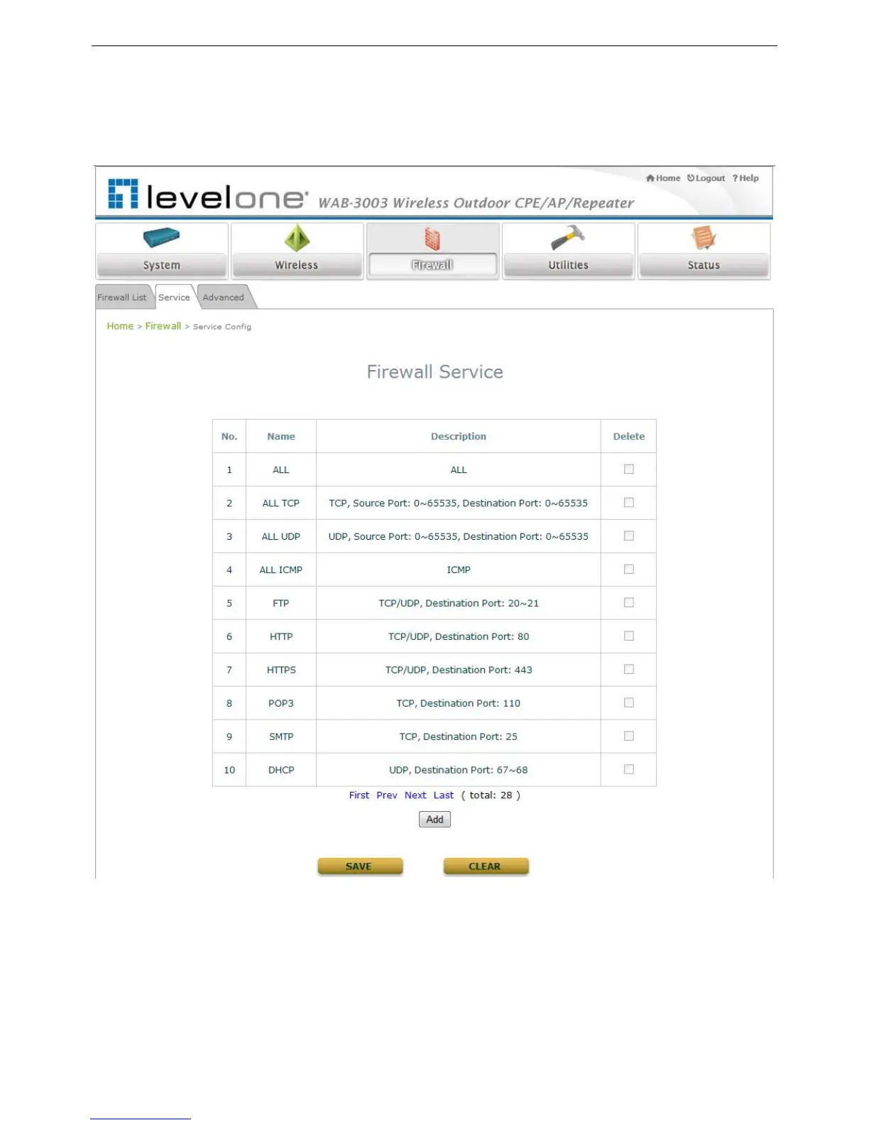 There are 28 firewall services available in default settings; these default services cannot be deleted but can be