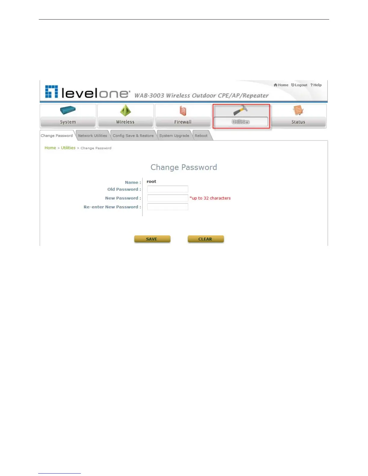 The administrator can maintain the system on this page: Change Password, Network Utilities,