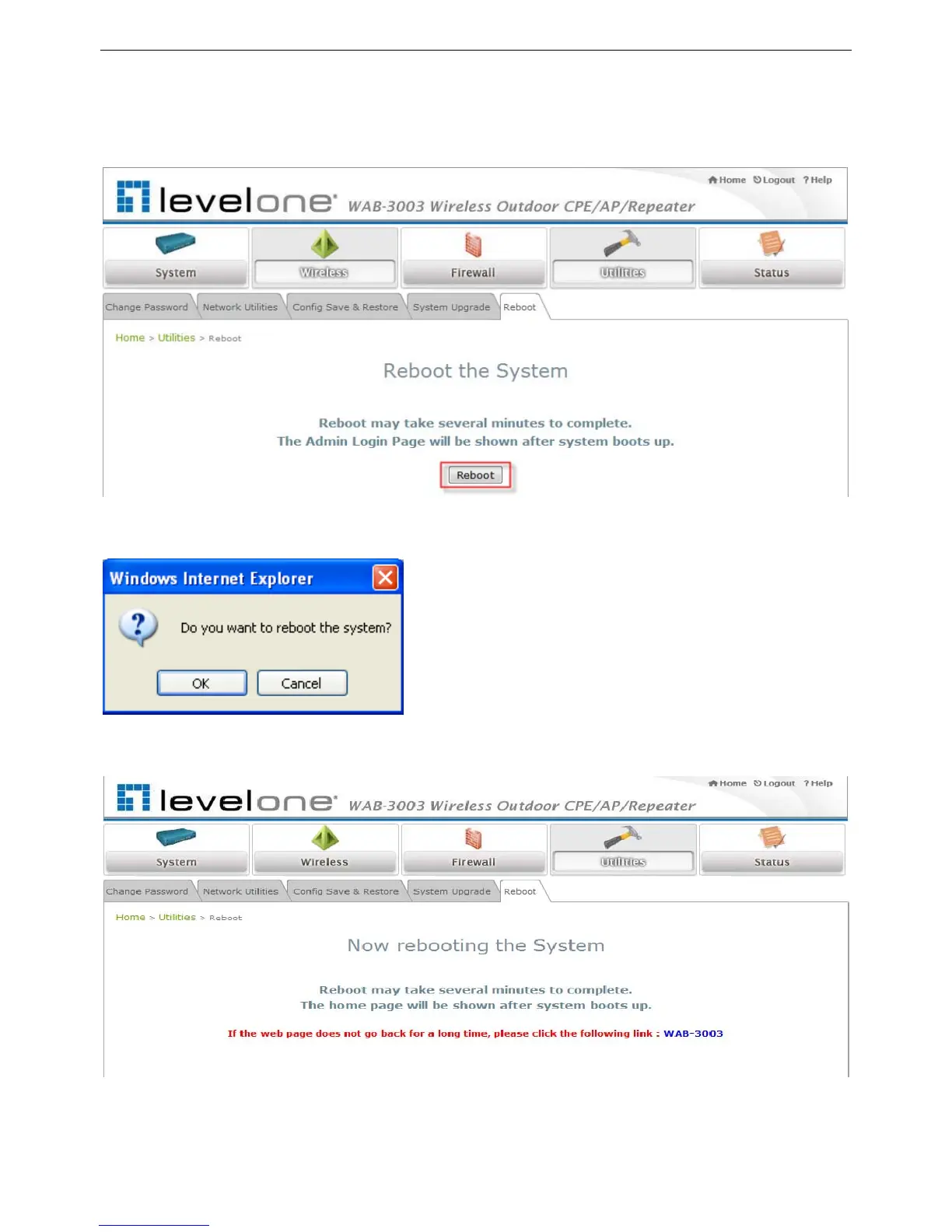 A pop-up screen will appear to confirm the request to restart the system. Click OK to proceed, or