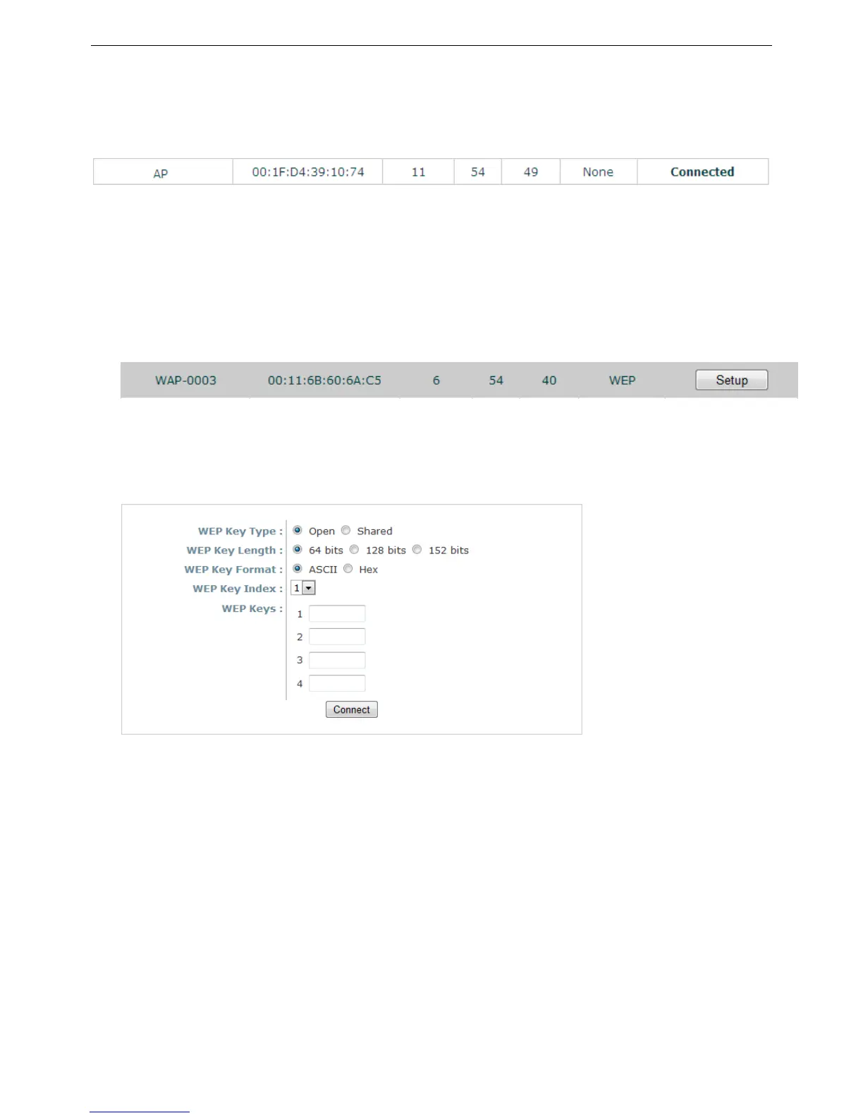 o WEP: Click Setup to configure the WEP setting for associating with the target AP.