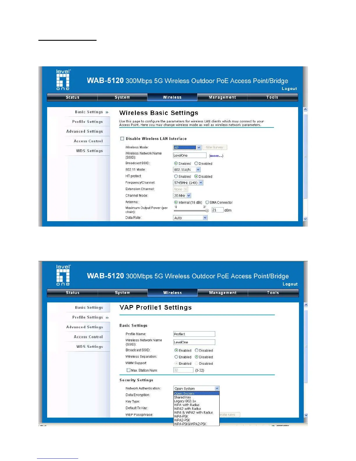 If security is required, open Wireless > Profile Setting and enter “VAP Profile 1 Settings” as