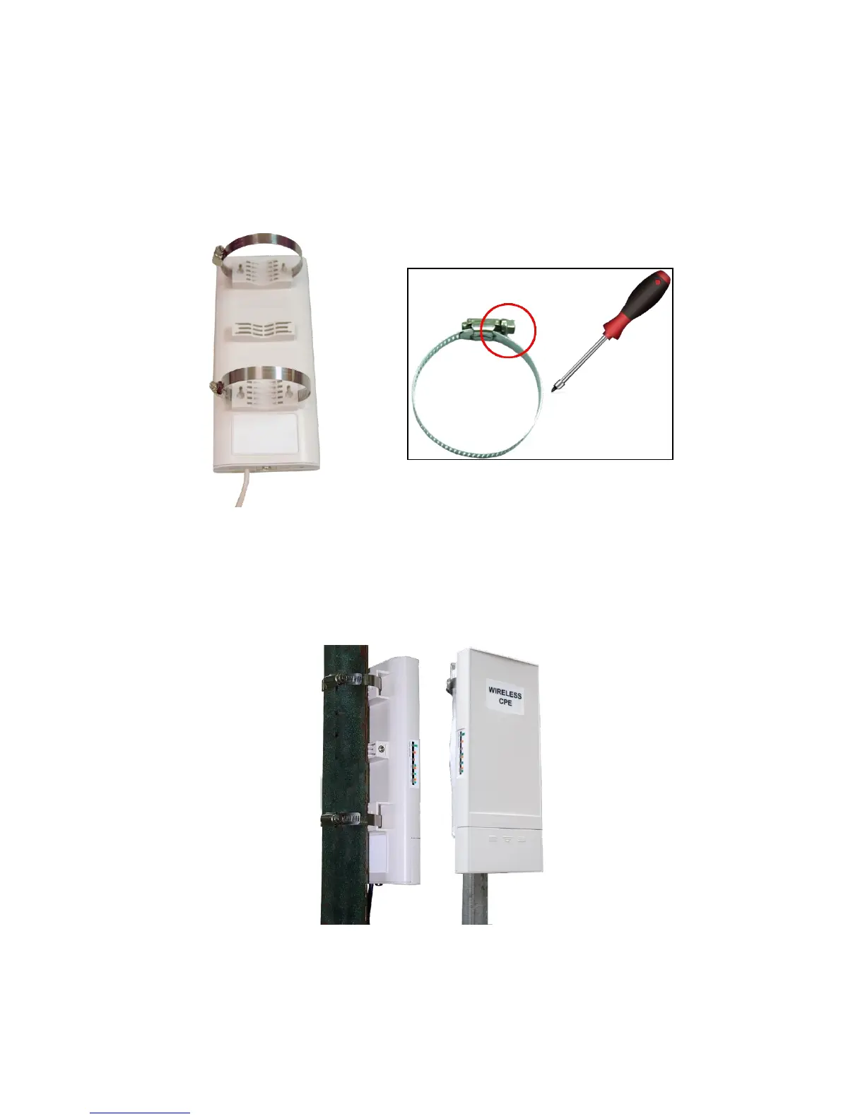 1. Turn the CPE over. Put the pole mounting rings through the middle hole of it. Note that you