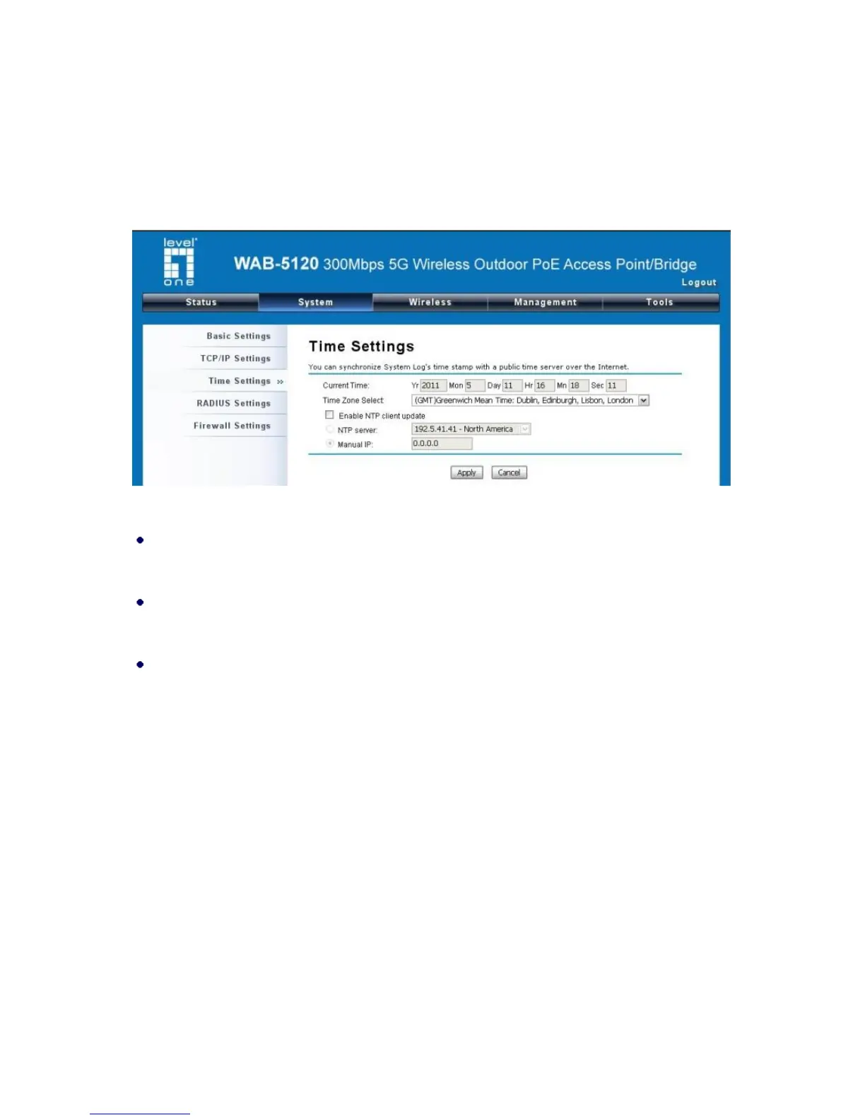 capable of keeping its time in complete accord with the Internet time. Make configuration in “Time