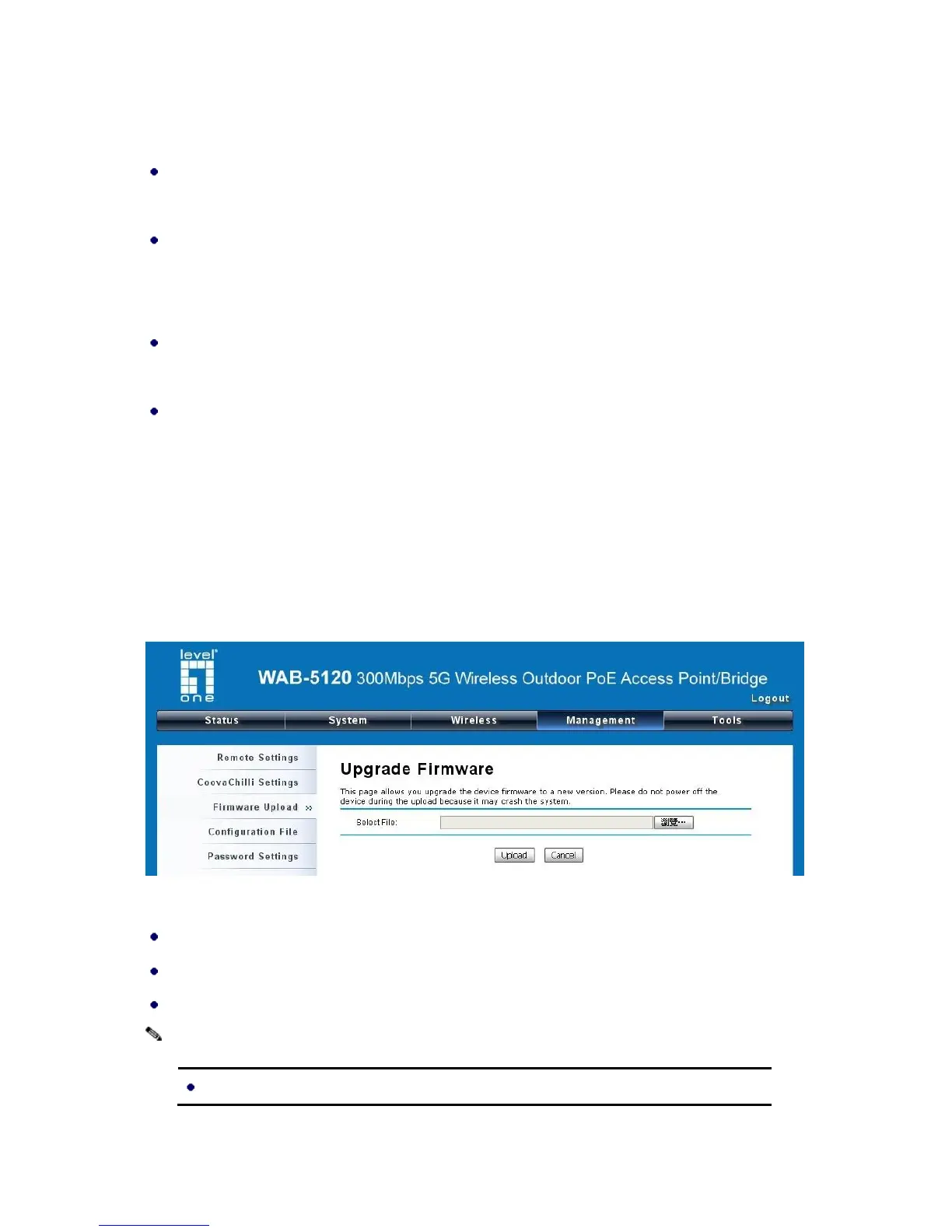 Open “Firmware Upload” in “Management” and follow the steps below to upgrade firmware locally or