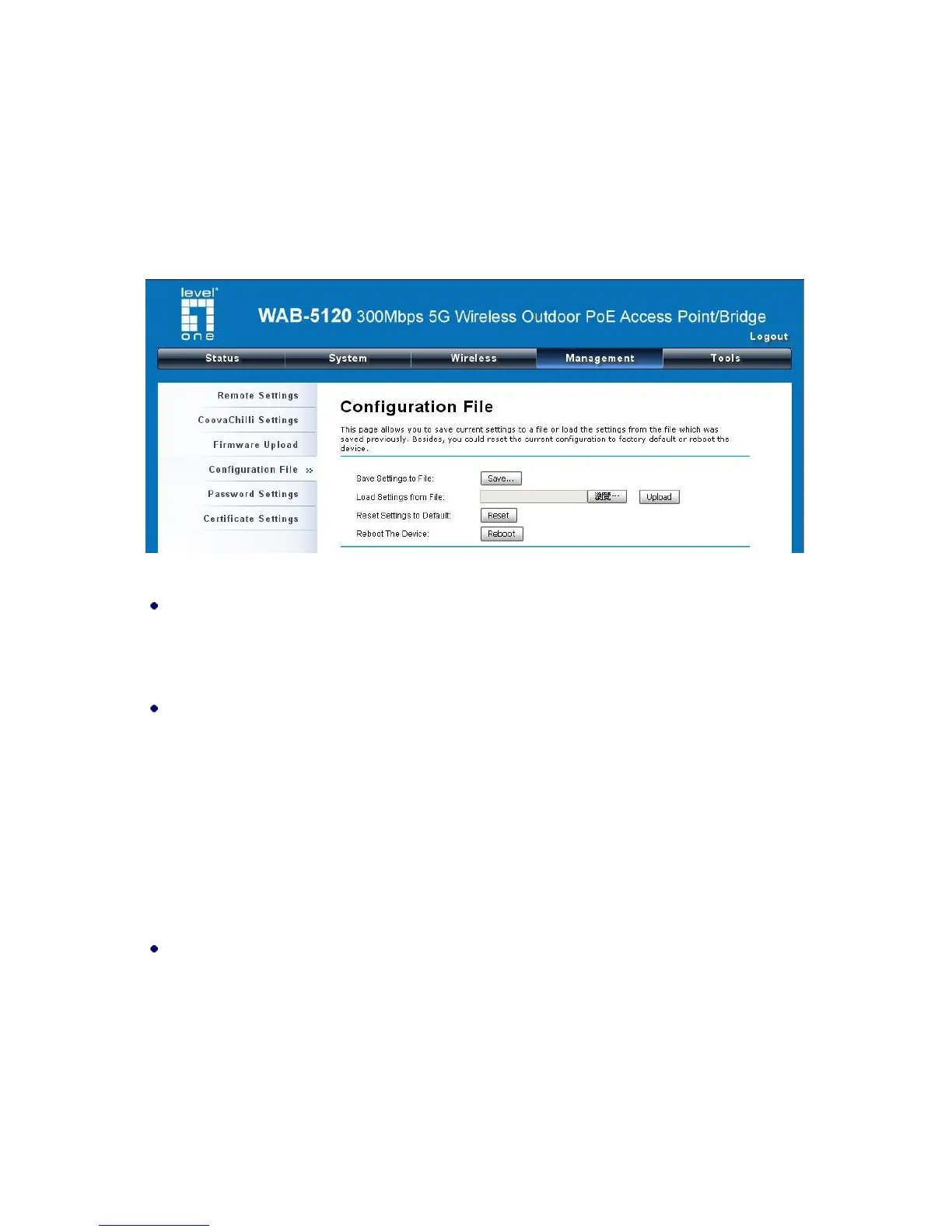 Click “Upload” to load the file. After automatically rebooting, new settings are applied.