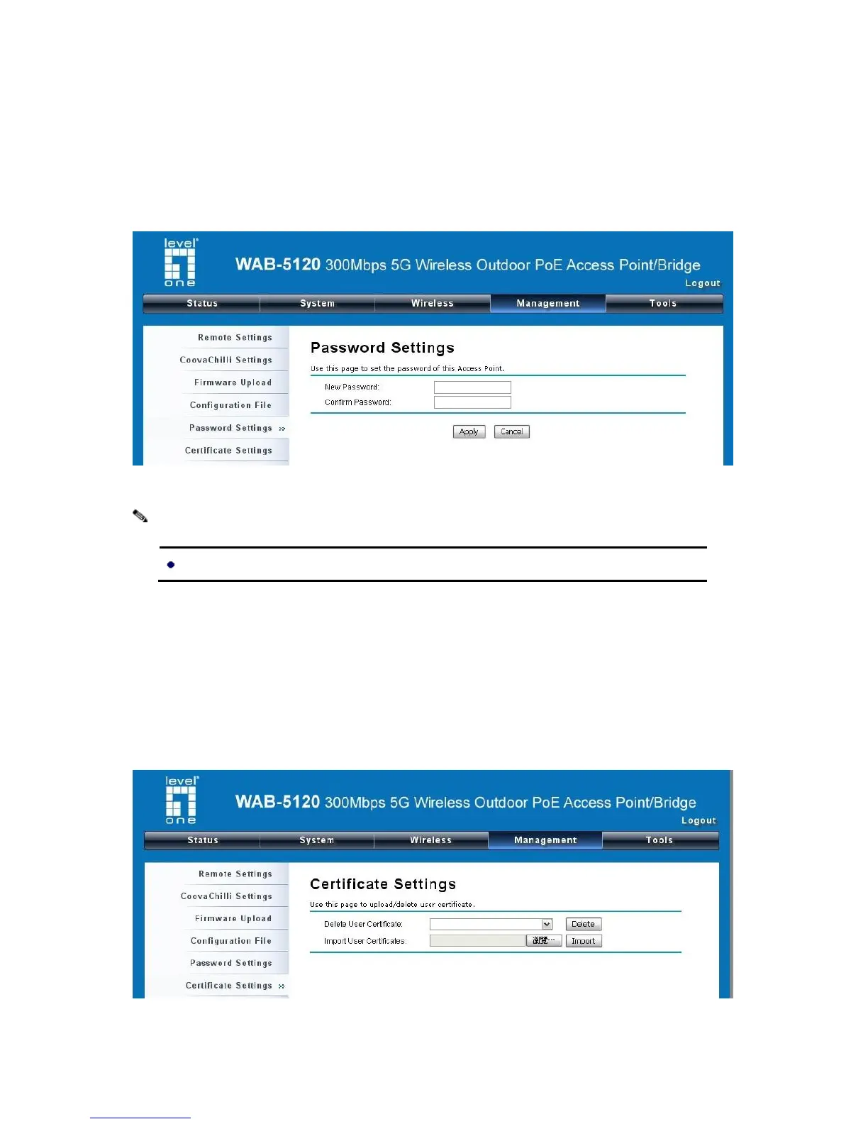 From “Password Settings” in “Management”, you can change the password to manage your device.