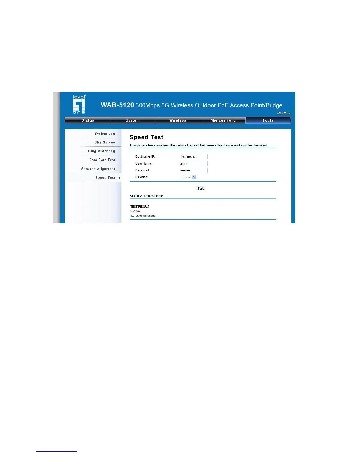 Test. The result will display in the bottom STATUS. You may test single TX/RX or bi-direction.