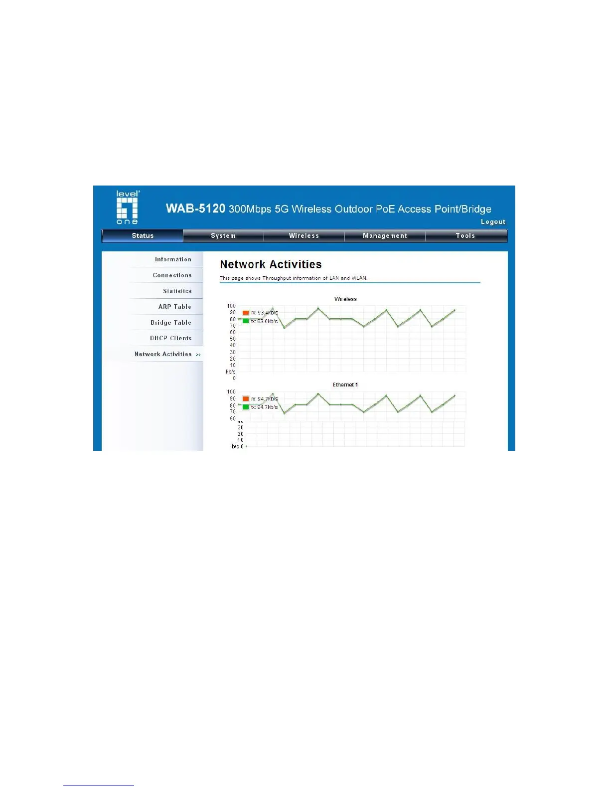 The network activities allows you to monitor the current Wireless and Ethernet TX/RX data traffic in