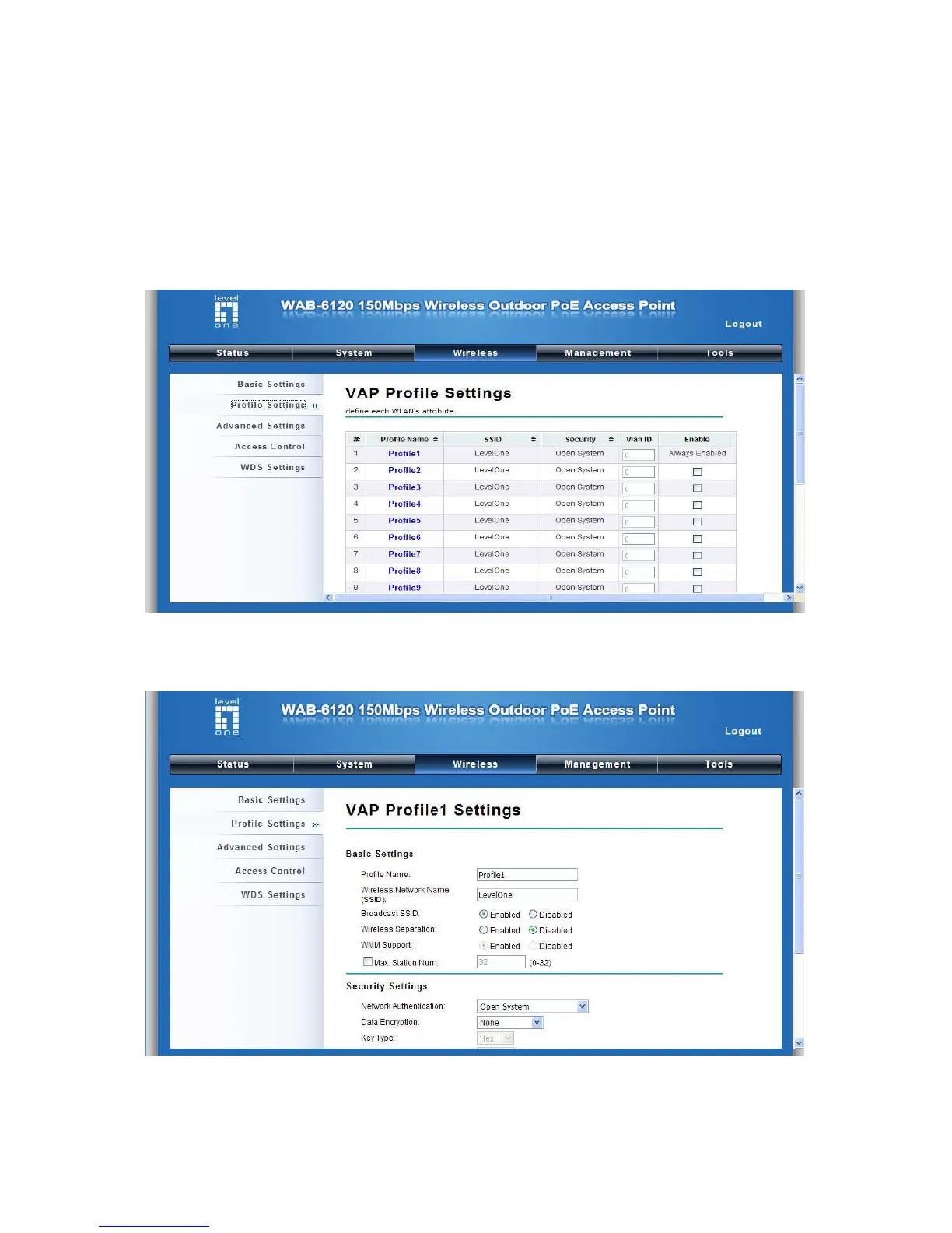 To create a virtual AP, you may check the Enable box of the profile and click on the profile (eg. Profile