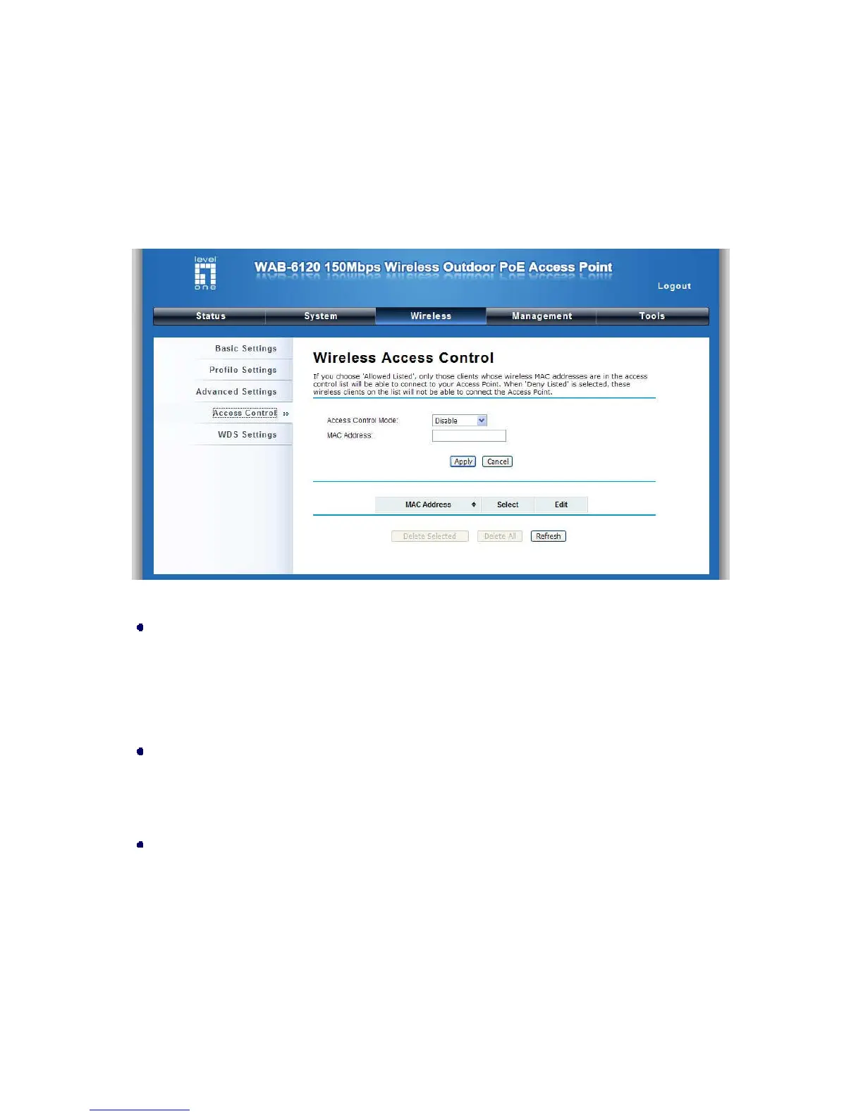 The Access Control appoints the authority to wireless client on accessing LEVELONE 150MBPS