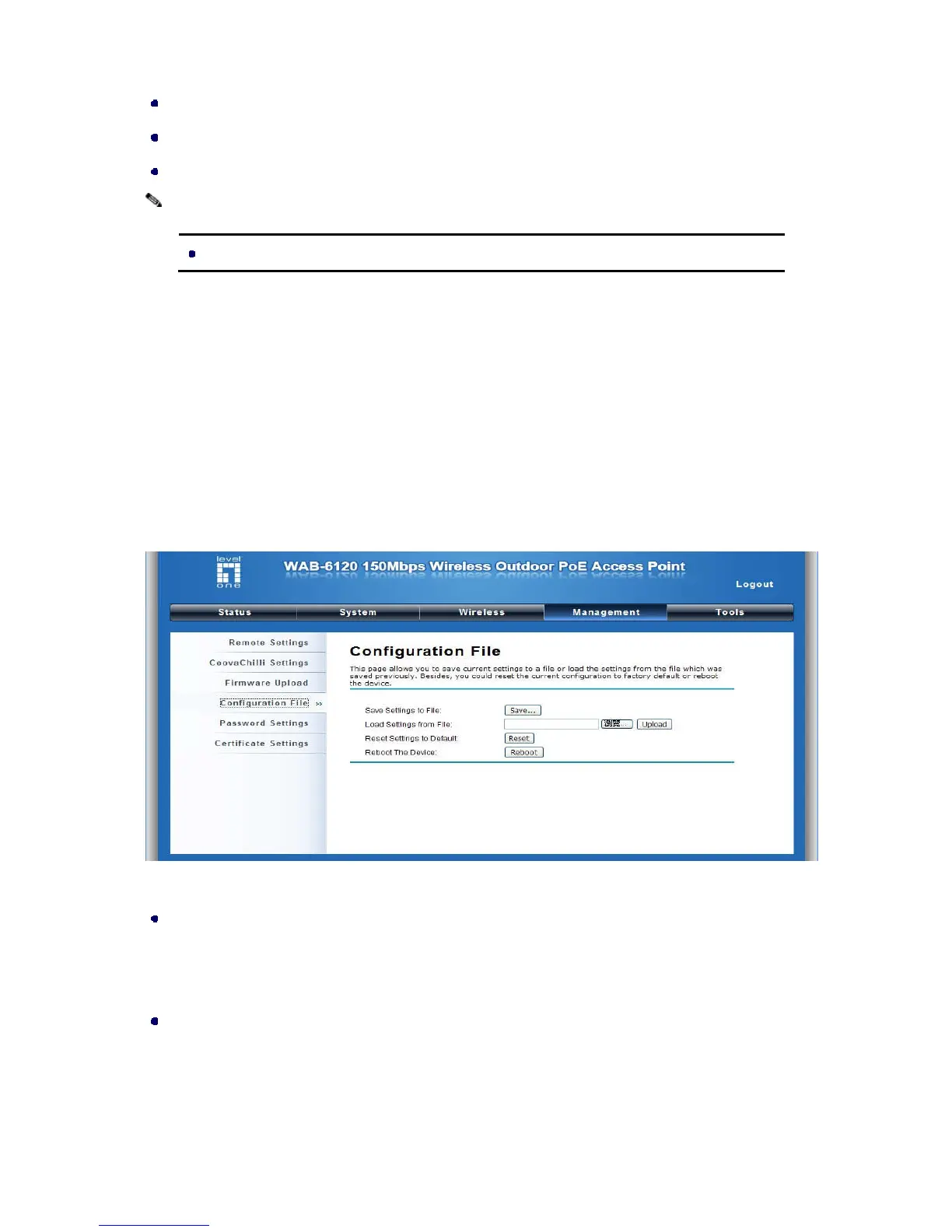 Click “Upload” to load the file. After automatically rebooting, new settings are applied.