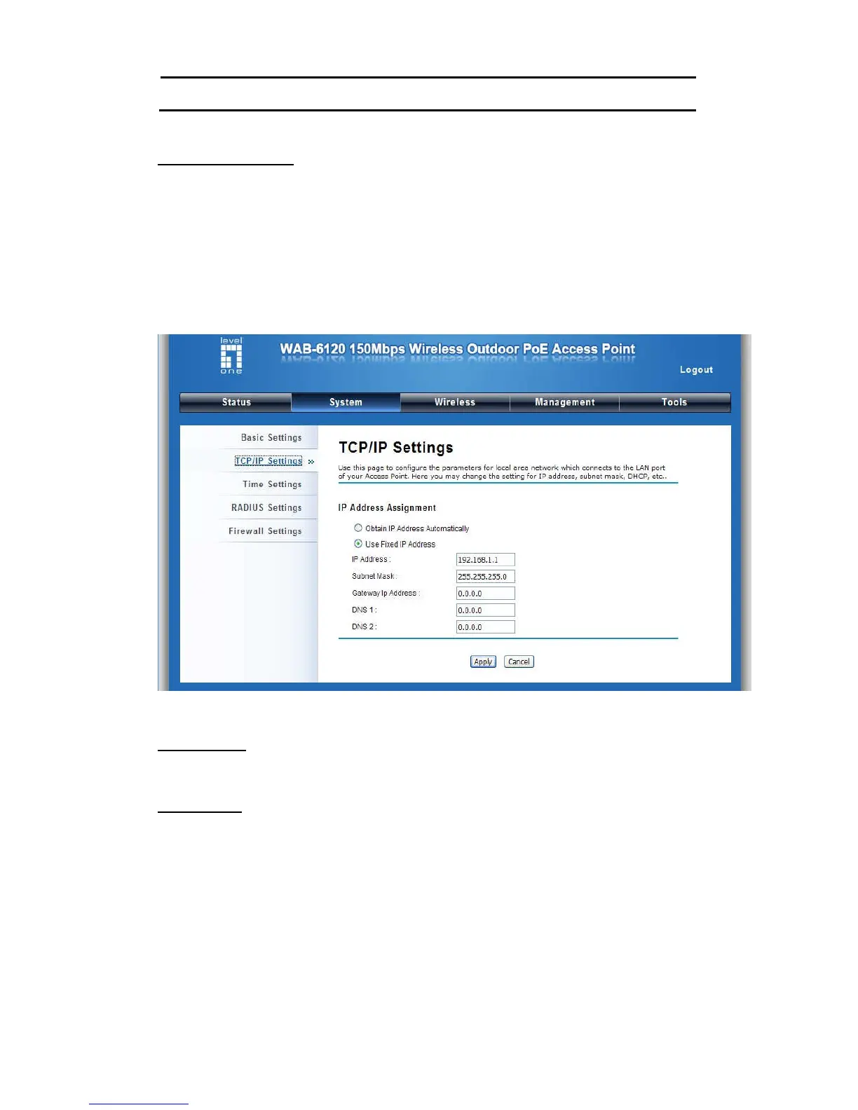 enter WAN IP Address, Subnet Mask, Gateway settings provided by your ISPs.