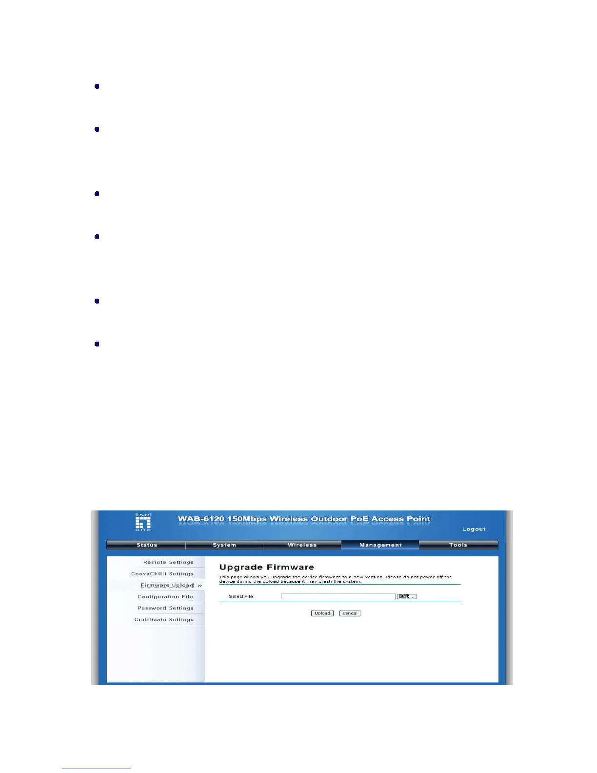 Open “Firmware Upload” in “Management” and follow the steps below to upgrade firmware locally or