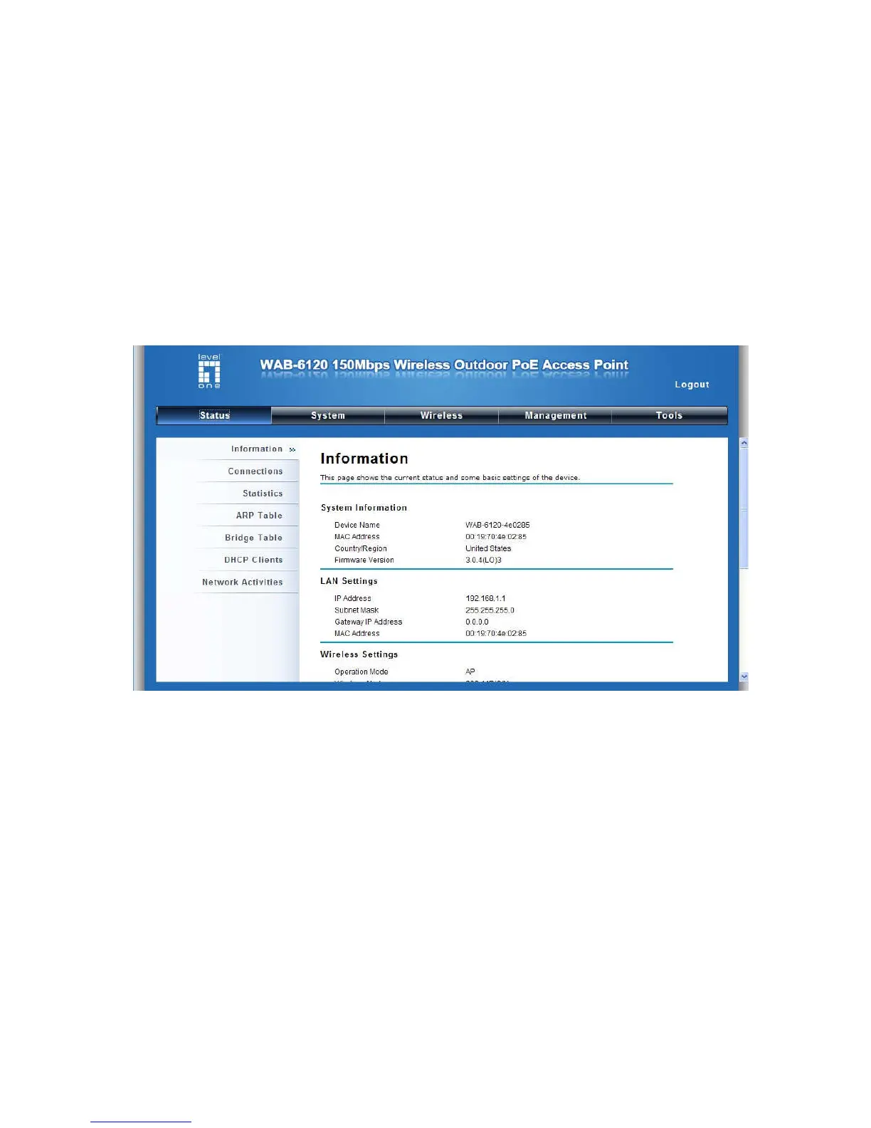 Information includes system information, LAN settings, wireless setting and interface status. Click