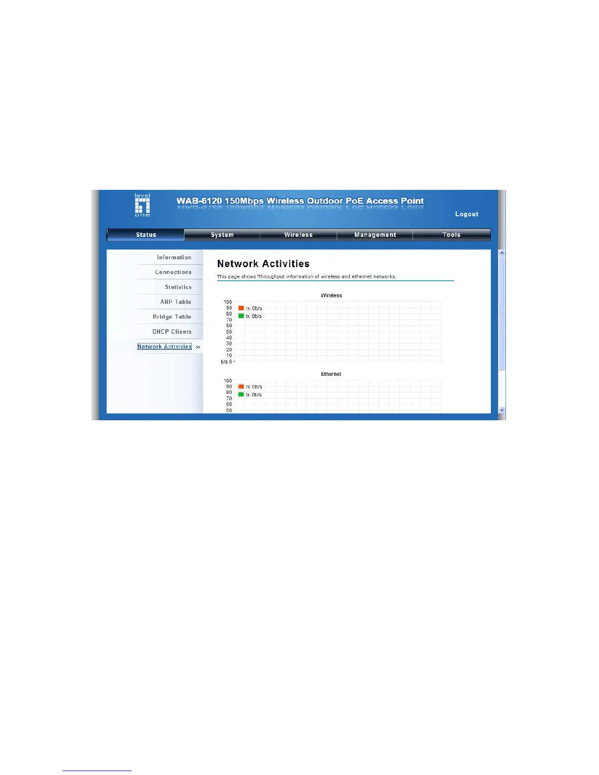 The network activities allows you to monitor the current Wireless and Ethernet TX/RX data traffic in
