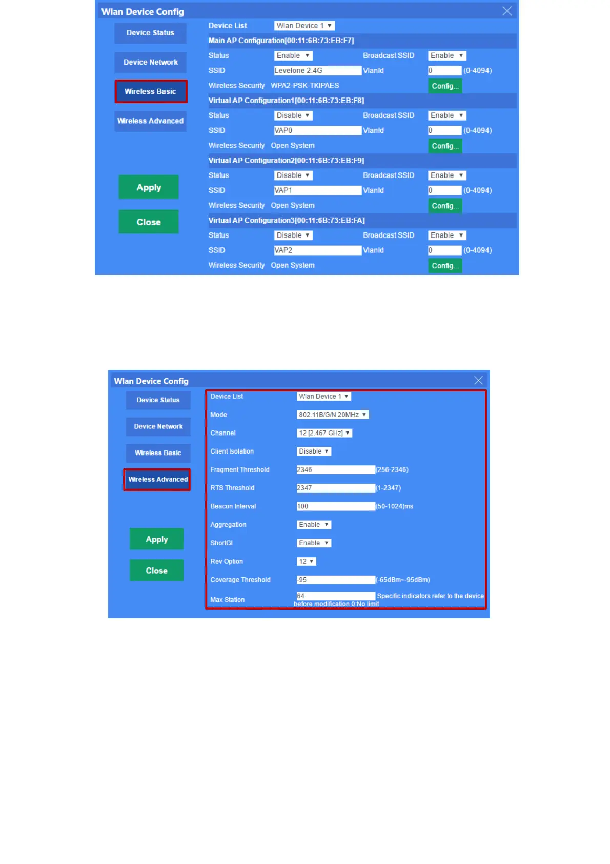 Wireless advanced setting mainly for AP’s wireless parameters, including Device List; Mode; Channel; Client isolation;
