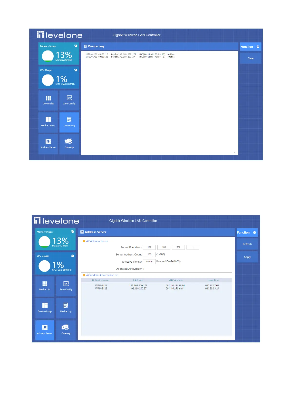 Device Log show AP’s record, such as on line recording, offline recording, device configuration recording.
