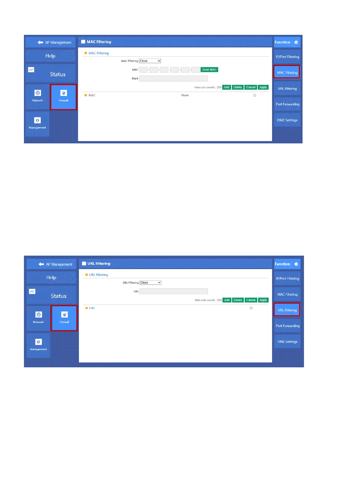 Enabling Mac filtering, router will restrict data forwarding based on the selected filtering rules; When selected Close, router