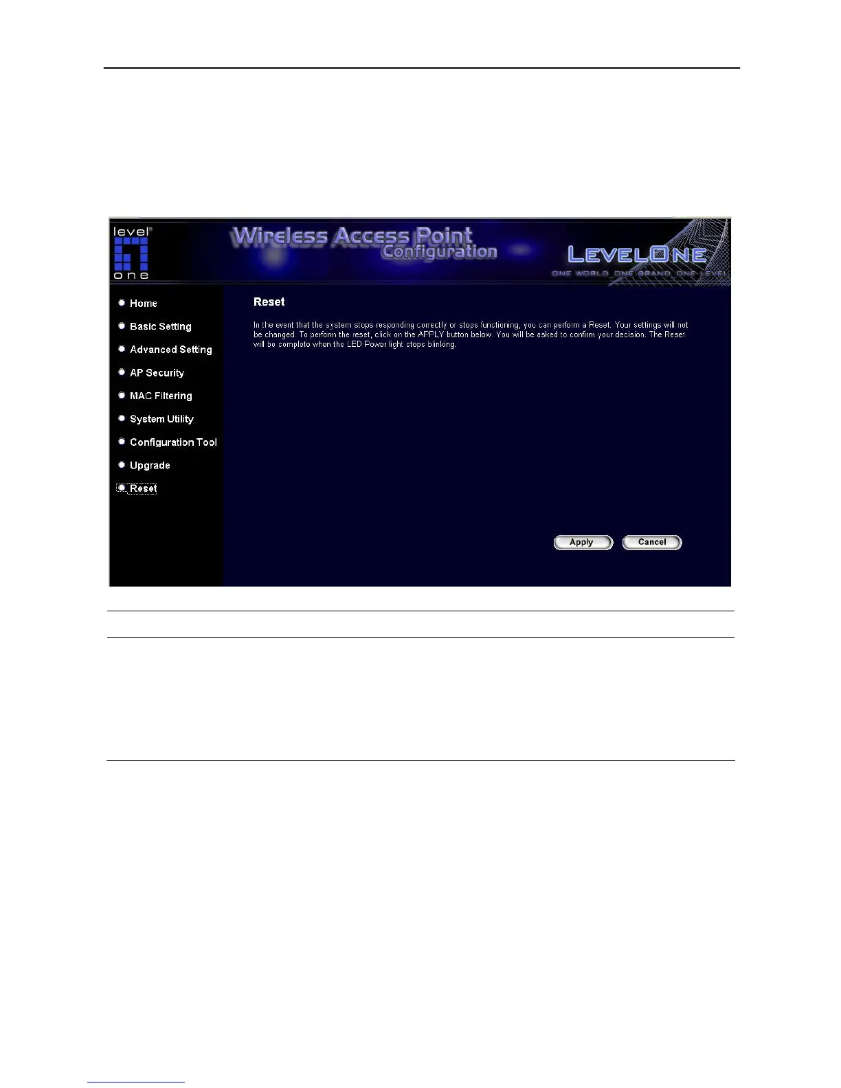 User can reset the Access Point’s system should any problem exist. The reset function