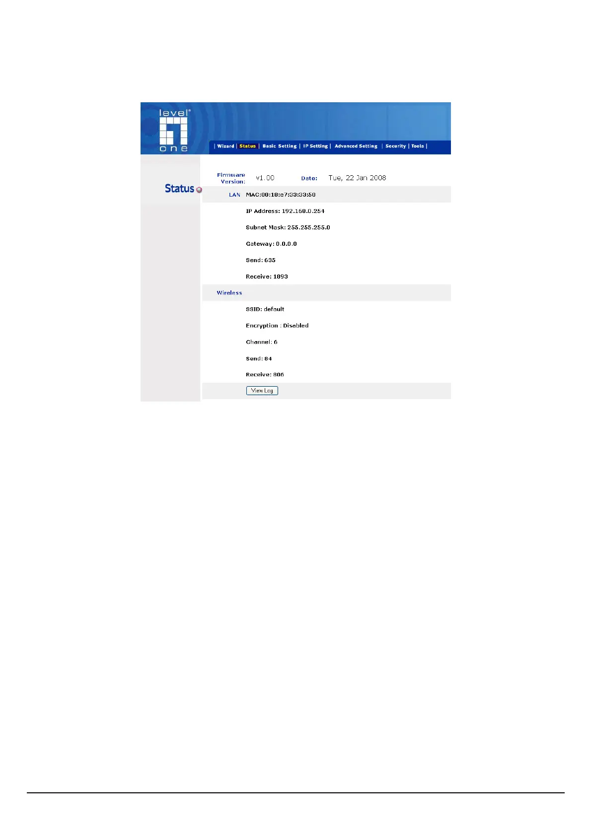 Shows the Mac address, IP address (default: 192.168.0.254), Subnet Mask, Gateway Address. The