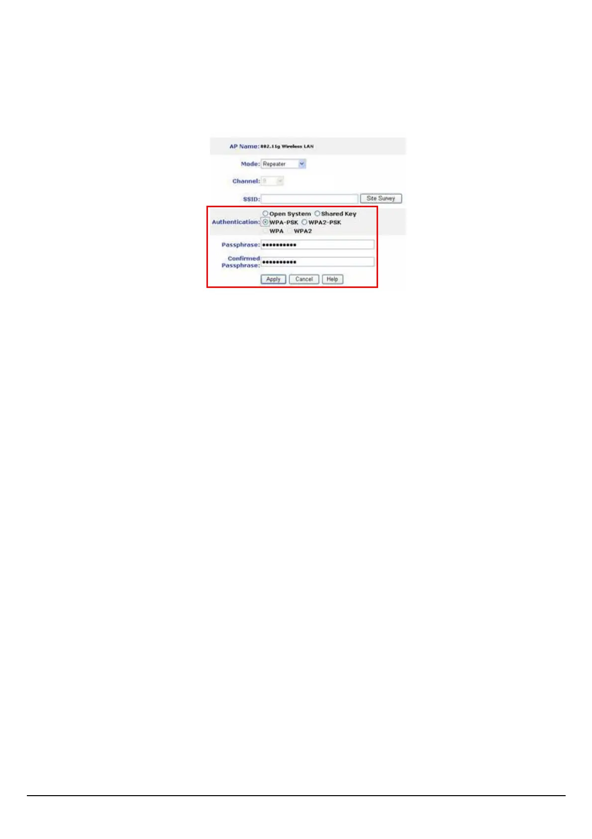 If WPA-PSK or WPA2-PSK is selected, user needs to set the key in the passphrase field as the